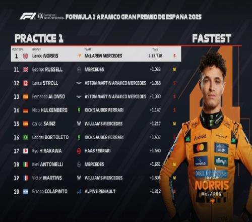 F1西班牙站一练:诺里斯全场最快,维斯塔潘P2,汉密尔顿P3